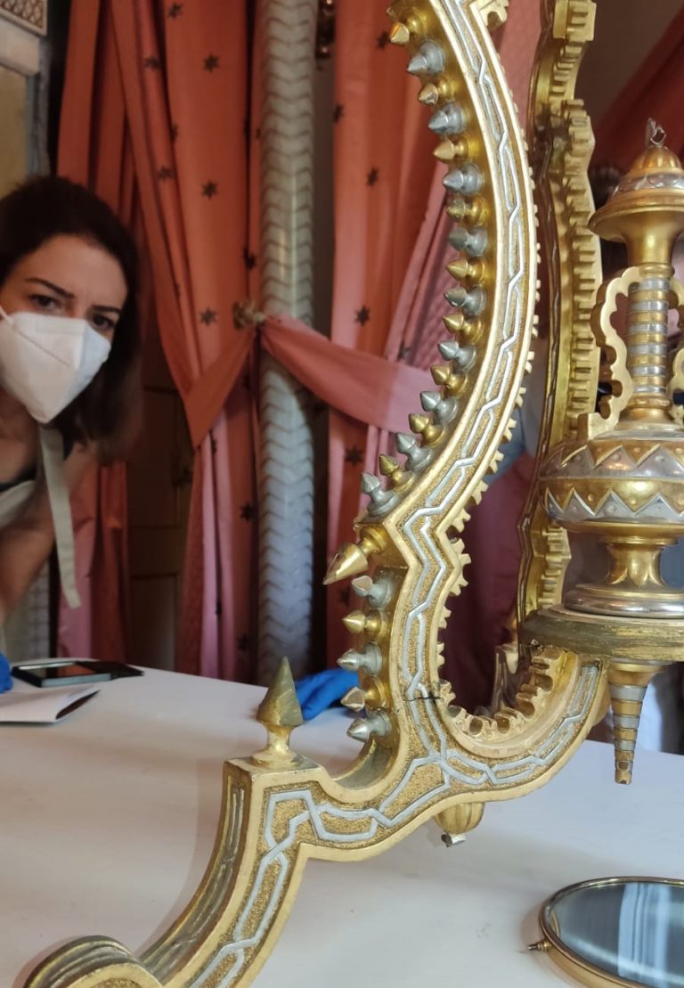 Espectacular qualitat dels daurats i platejats del dormitori rosa d’estil àrab. Els mobles i les sedes brodades amb fils d’argent van ser servits per J.Reig el 1873.