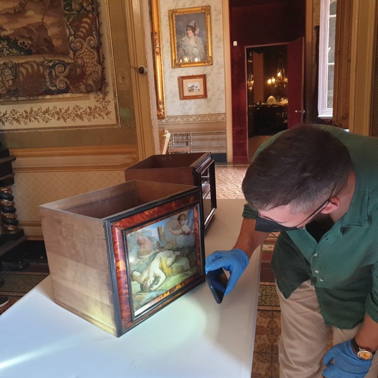 Els vidres pintats d’un escriptori barroc han estat un dels temes tractats a la pràctica de catalogació de mobles amb alumnes d’Història del Moble fins el 1900. Aprèn, practica i actua al Museu Palau Mercader.