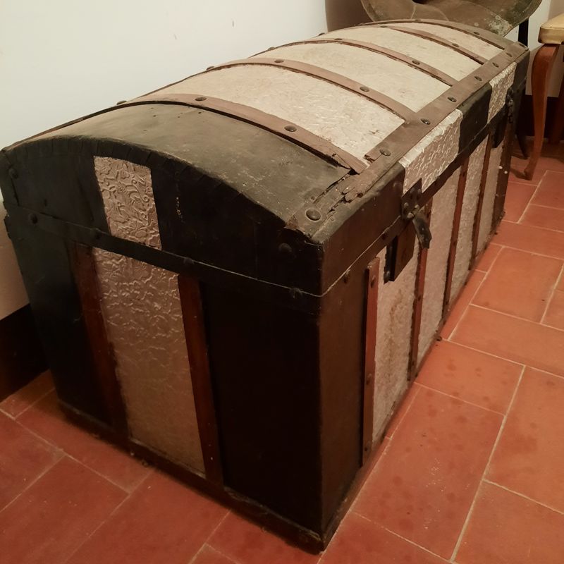 Contenidor de buc profund i tapa convexa, construït amb posts de fusta. L'exterior està recobert per planxes de llauna amb dibuix estampat -actualment repintades en color platejat-, fixades per llistons de pi clavats per claus de cap rodó, configurant una trama de paral·leles. Els angles i el perímetre de la tapa estan protegits per bandes cantoneres de llauna pintades de negre. Tanca amb dos pestells rectangulars situats en el frontis. L'interior deixa a la vista els llistons de pi pintats (segons sembla a la foto), i es percep que a la tapa estan col·locats tot al llarg per configurar la corba de la forma.