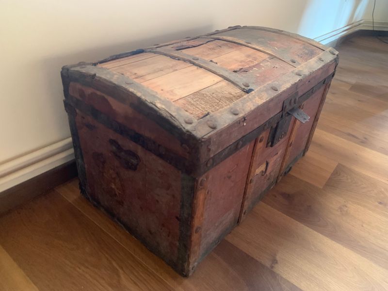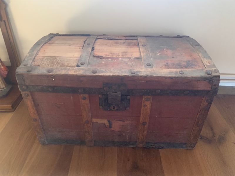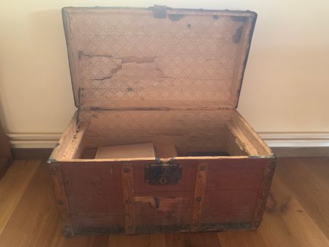 "Cos i travesses de fusta amb un contorn metàl·lic a la part baixa de la tapa que enllaça amb el tancament també de ferro. Anses als laterals metàl·liques i grans claus de forro que agafen les travesses de fusta que reforcen l’estructura. Per dins forrada de paper. Peça al lateral esquerre que fa de topall per controlar l’obertura fins a un màxim.