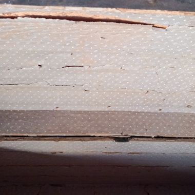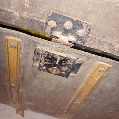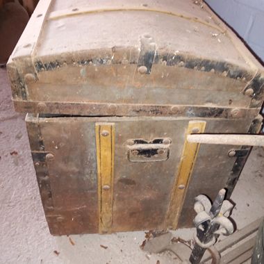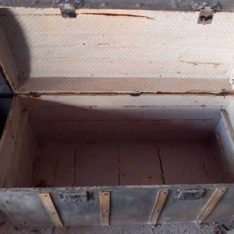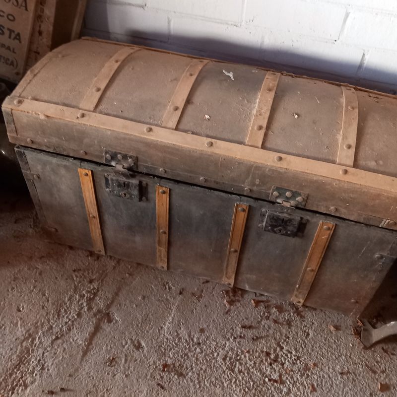 Contenidor de buc profund i tapa convexa, construït amb posts de fusta. L'exterior està recobert per planxes de llauna fixades per llistons de fusta clavats per tatxes, configurant una trama de paral·leles. Els llistons estan pintats de groc i dues línies negres paral·leles, tot al llarg. Els angles i el perímetre de la tapa estan protegits per bandes de llauna. Tanca amb dos panys rectangulars situats en el frontis. En els laterals estan fixades les nanses de metall. L'interior està folrat per un paper estampat de color blau i mostra blanca petita.