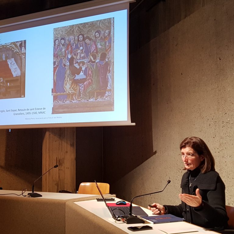 En la seva conferència, La Mónica Piera es fixa en el mobiliari que hi apareix al retaule, i que ens mostra com era l’espai domèstic a l’època gòtica.